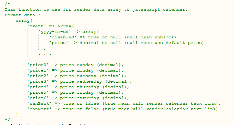 We use data array for rendering data price and blocking in calendar. Format array data is like below :